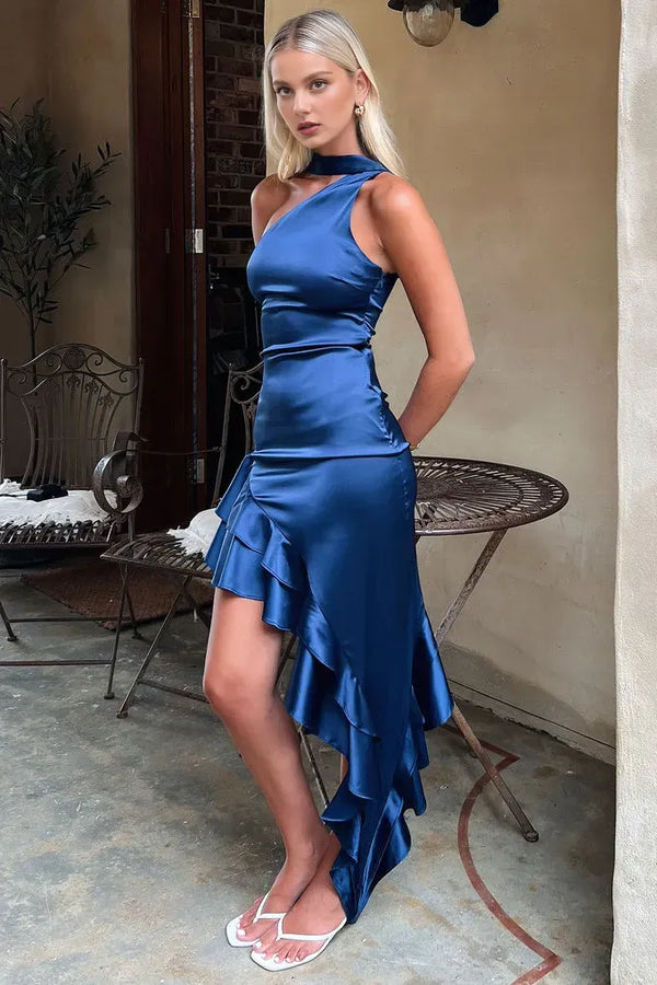 Unique Navy Blue One Shoulder Satin Prom Dress ,Evening Party Dresses,WGP2071