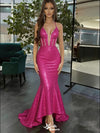 Modern Hot Pink Sequin Prom Gown Sexy Illusion V-Neck Mermaid Sparkly Evening Dress,WGP2090