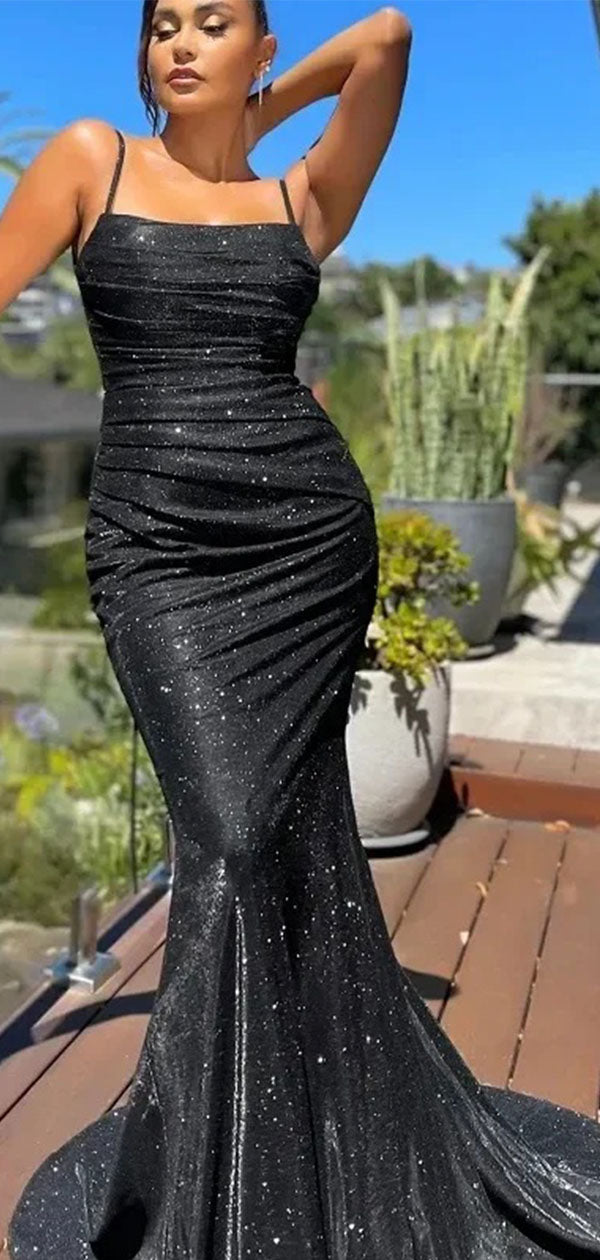 Sparkly Black Spaghetti Strap Mermaid Long Prom Dress Ideas, Evening Party Dresses,WGP1909