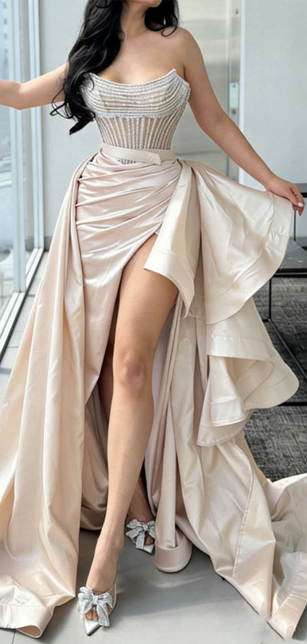 Fancy Pearl Beaded Corset Prom Dress Strapless High Slit Satin Ruched