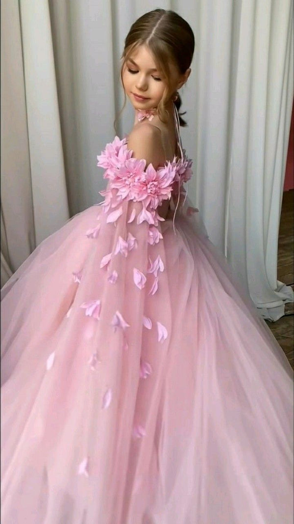 Cute Pink Off-Shoulder Floral Long A-Line Flower Girl Dress , FG026