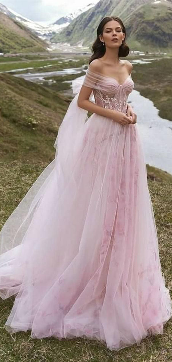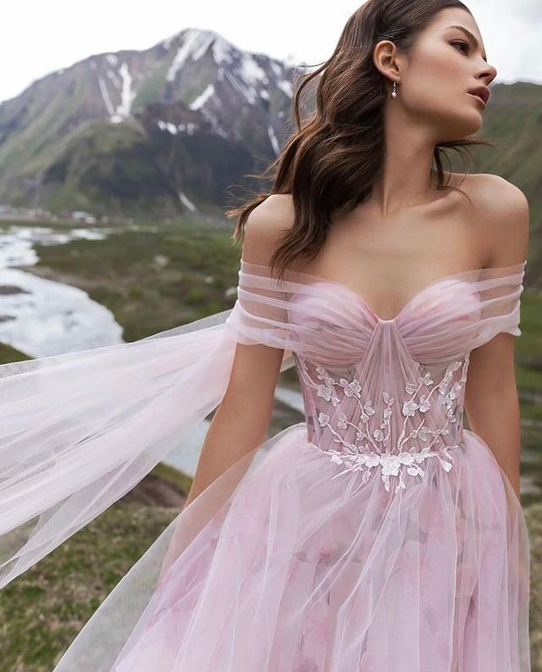 Elegnat Off-The-Shoulder Tulle Wedding Dress Pink Floral Applique Fair